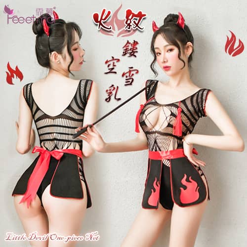 小惡魔連身網衣!鏤空雪乳流蘇火紋印花分片式圍裙三件組